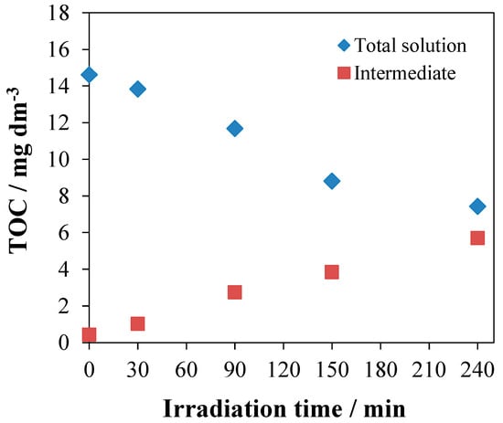 TOC measurements were also carried out to clarify the mineralization process. The TOC representing the intermediates was estimated from the difference between the total TOC concentration of the reaction mixture and that of the unreacted 1,4-HQ. The result indicated that the TOC concentration of intermediate products increased during the photodegradation, while the total TOC of the reaction mixture steadily dropped from 14.6 to 7.4 mg dm−3 (Figure 13). It implies that a considerable part of the intermediates was mineralized to CO2 and H2O.