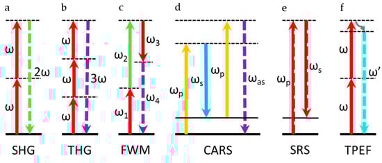 Coherent anti-Stokes Raman scattering (CARS) belongs to a special case of FWM, which is a third-order nonlinear phenomenon. The main difference between CARS and FWM is that the resonance enhancement of CARS is generated by the vibrational transition. CARS is mainly used in physics, chemistry, and other related fields. The energy diagram is shown in Figure 2d. This process is an example of an optical parametric process. Pump beam and Stokes beam with different frequencies are usually used to excite the sample. When the frequency difference of the pump light and Stokes light is equal to the vibration frequency of the intrinsic vibration mode of the molecule, it can produce an anti-Stokes signal under the action of another probe light , which satisfies the formula . Usually, the probe beam and the pump beam are fixed at the same frequency, i.e., . Then, the above formula becomes []. CARS was discovered by Maker and Terhune in 1965 []; however, it was not applied to spectroscopy until 1974 because of the development of high peak power tunable lasers []. As a coherent process, the scattering cross-section of CARS is several orders of magnitude larger than the spontaneous Raman scattering, which is very suitable for high-speed imaging [,]. The image resolution of CARS is significantly better than traditional molecular Raman microscope. In addition, the distribution of molecular bonds can be measured very clearly. CARS has the characteristics of chemical selectivity, high sensitivity, high spatial resolution, and fast data acquisition rate, and it shows a quadratic dependence and a linear dependence of the intensities of the pump light and Stokes light, respectively.