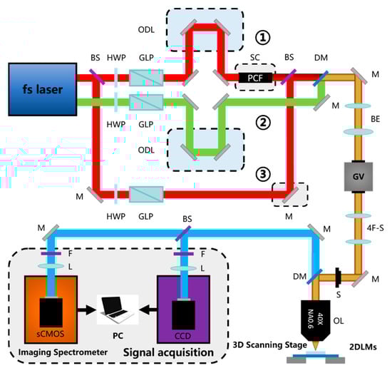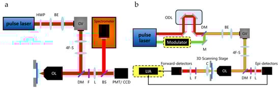 - Kang, D.; Li, R.; Cao, S.; Sun, M. Nonlinear optical microscopies: Physical principle and applications. Appl. Spectrosc. Rev. 2020. [Google Scholar] [CrossRef]