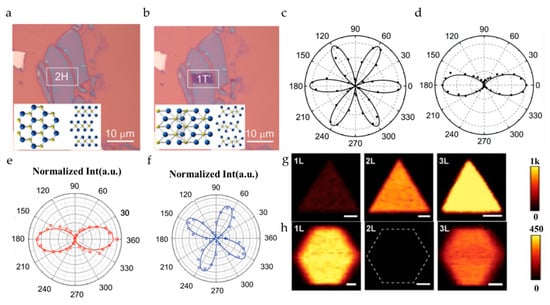 Different synthetic methods are essential for synthesizing 2D materials with different crystal phases, and the rapid identification of crystal phases is beneficial to optimize the preparation process. For example, the cooling step plays a crucial role in the synthesis of 2H and 1T’ MoTe2. As shown in Figure 7e, it is the polar plot of SHG intensity of a three-layer 1T’ MoTe2 synthesized under rapid quenching, which can be fitted to . On the other hand, Figure 7f shows the polar plot of SHG intensity of a 2H MoTe2 synthesized under a slower cooling process, which can be modeled to []. Zeng et al. [] adopted a similar method to obtain WS2 and WSe2 of 3R and 2H phases. The process difference is that hexagonal 2H is obtained at a higher deposition temperature. With the gradual optimization of the growth process and the understanding of the material itself, the difference in the dependence of the number of layers, and the SHG intensity, and the shape of the synthetic material can be used as the basis for identifying the crystal phase (Figure 7g,h).