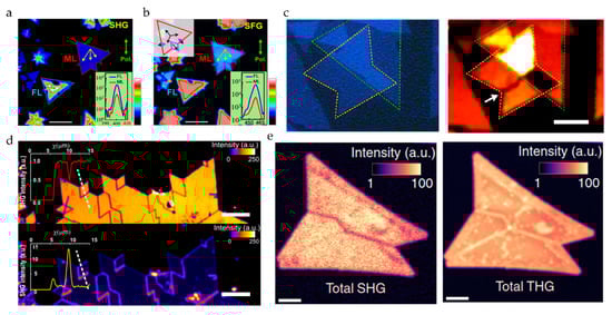 As a branch of modern optics, nonlinear optics (NLO) has developed into a key technology, which has been widely used in material characterization, light generation, quantum optics, and other fields []. It is very convenient to combine NLO and microscope techniques to image 2D materials. Generally, strong nonlinear signals can be acquired through the excitation of tens of milliwatts of laser energy, which enables multi-modal fast scanning to be completed in a short exposure time. High spatial resolution can be achieved by combining with a high numerical aperture objective lens further. The current research on the NLO response of 2D materials can be divided into two aspects. On one hand, it aims to apply a nonlinear response for the fabrication of various functional devices. On the other hand, the NLO response is used as a means of 2D material characterization. With the development of research in recent years, NLO has shown its potential as a powerful characterization tool. For example, second-harmonic generation (SHG) is one of the well-known NLO characterization techniques, which is widely used in the research of crystal axis orientation and other related directions. The application of third-harmonic generation (THG) and four-wave mixing (FWM) techniques in determining the layer numbers and anisotropy of crystallinity are also explored. Furthermore, some new nonlinear techniques, such as coherent Raman spectroscopy, have recently attracted increasing attention due to their superior sensitivity to the chemical specificity of materials, which gradually becomes a promising candidate to replace the spontaneous Raman spectroscopy.