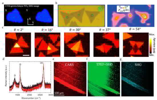 (a) SHG image of the CVD-grown bilayer WS2. Reproduced from [], with permission from American Chemical Society, 2014. (b) Left panel: Optical microscopy photograph of a region of a substrate containing MoS2 flakes grown by CVD. Right panel: SHG microscopy photograph of the same region. Reproduced from [], with permission from American Physical Society, 2018. (c) SHG intensity mapping of artificially stacked MoS2 bilayers with various stacking angle (θ). Reproduced from [], with permission from American Chemical Society, 2014. (d) The Raman spectrum of graphene grown on unpolished Cu foils. (e) The CARS (Raman shift of 1360 cm−1). (f) The TPEF + SHG; (g) The SHG image of graphene. Reproduced from [].