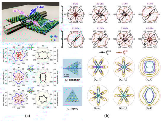 In addition to MoTe2, the crystal phase of the layered group III–VI semiconductors has also been studied by SHG []. It is theoretically proved that when hydrostatic pressure is applied to the InSe material, a transition of the crystal structure can be achieved. The evolution of the polar plots revealed by SHG microscopy shows a symmetrical transition from 3-fold rotational symmetry to mirror symmetry, and when the pressure is released, this structural change is restored to the original state. During the change of pressure, the SHG intensity remains at the same order of magnitude, and it does not suddenly disappear, indicating that the phase transition does not occur when the structural symmetry changes []. Alloying 2D materials is a novel way to tune the SHG intensity. It is revealed by the polarization-resolved SHG that this method does not cause a phase transition of crystal, which has been illustrated both in InSe and TMDs [,].