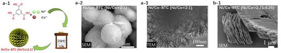 (a) Preparations scheme and morphology of Ni(/Co)-BTC [30] and (b) morphology of Ni3−xCox(BTC)2·12H2O] (x ≈ 0.25) [31]. Reproduced with permission from Reference [30], 2020, Elsevier and [31] 2019, Elsevier.