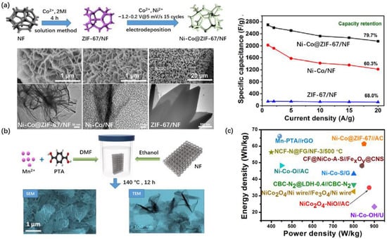 (a) Preparations scheme, morphology and electrical performance of Ni-Co@ZIF-67/NF arrays, Ni-Co/NF nanosheets and ZIF-67/NF nanosheets [47]; (b) preparations scheme and morphology of Mn-PTA/NF [48] and (c) their assemble SC performance. Data from References [47,48]. Reproduced with permission from References [47,48], 2020, Elsevier.