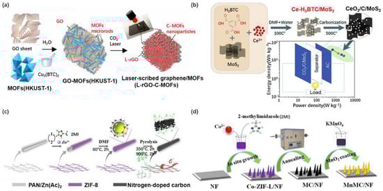 The schematic diagram of the preparation approach of (a) L-rGO-C-MOF [73], (b) CeO2/C/MoS2 (derived from Ce-BTC) [74], (c) ZIF-8-derived NCT [76] and (d) ZIF-derived MnMC on NF [77]. Reproduced with permission from References [73,74,76,77]. Elsevier, 2020.