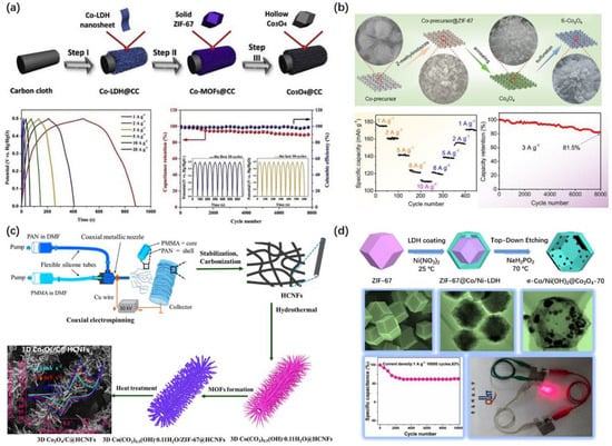 CoOx, NiOx and their ternary TMOs are mainly derived ZIF subfamily. As a binder-free electrode, binder-free 3D hollow Co3O4 polyhedral arrays [92] on CC Co3O4-60@CC derived from ZIF-67, with the in situ growth reaction time of 60 min in the step II, delivers high specific capacitance of 806 F g−1 at the current density of 1 A g−1 (Figure 5a). Another binder-free work [93] revealed that sulfur doping can increase electronic conductivity of Co3O4 on NF to decrease the electrochemical impedance and improve the rate capacity. The sulfur-doped ZIF-67 derived Co3O4 on NF (S-Co3O4/NF), prepared via the hydrothermal, annealing and sulfurization methods (Figure 5b), delivered superior specific capacity of 178 mAh g−1 (1424 F g−1) at 1 A g−1 and good cycling stability (81.5% capacitance retention after 8000 cycles at 3 A g−1). Mukhiya et al. [94] synthesized binder-free 3D porous Co3O4/C@HCNFs (HCNFs = hollow carbon nanofibers) by the preparation of graphitic-carbon-intermingled porous Co3O4 nanotentacles, which exhibit an excellent specific capacity of 1623 F g−1 at 1 A g−1 and long cyclic life, as well as good rate capability (Figure 5c). Bao et al. [95] utilized ZIF-67 as the template and NaH2PO2 as the etching agent to construct a series of Co3O4 embedded α-Co/Ni(OH)2 hollow nanocages (Figure 5d). The obtained α-Co/Ni(OH)2@Co3O4-70 with heterostructure yields a specific capacitance value of 1000 F g−1 at 1 A g−1, which is superior to the component alone (α-Co/Ni(OH)2: 392 F g−1 and Co3O4: 368 F g−1). The high specific capacitance of the above Co3O4 composites takes the following advantages: (i) The direct growth of electroactive materials on substrate (CC, NF, HCNFs, etc.) without any binder could reduce “dead volume”, thus decreasing the resistance; (ii) the MOF-derived highly porous Co3O4 nanotentacles/arrays furnish high surface area and rich active sites for redox reactions; and (iii) the inheriting myriad mesopores and interconnected channels allow for the easy access of ions and fast reaction kinetics.