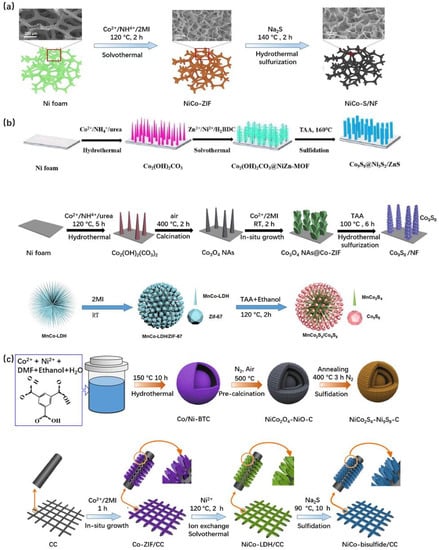 Schematic illustration of the preparation of metal sulfide (a) one-step synthesis of MOFs and one-step sulfidation [103], (b) multi-step synthesis of MOFs and one-step sulfidation b1 [108], b2: [102], b3: [106]; and (c) one-step synthesis of MOFs and multi-step to obtain sulfide from MOFs c1 [6], c2: [104]. Reproduced with permission from References [102,104,106]. Elsevier, 2020. Reproduced with permission from References [103,108]. Royal Society of Chemistry, 2020.