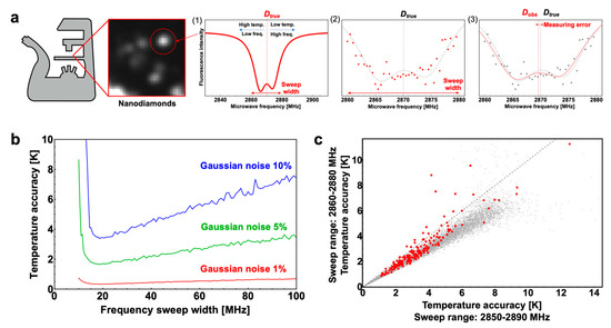 Monte Carlo simulation to determine the optimal sweep range for optically detected magnetic resonance (ODMR) frequency spectrum for temperature determination. (a) Schematic outline of temperature determination by ODMR. In the simulation, the ODMR frequency spectrum obtained by a digital frequency sweep during the fluorescence intensity measurements, as shown in (2), was generated at random. (b) Simulated temperature measurement accuracy of the frequency sweep width centered at 2870 MHz. The results applied Gaussian noises at 10%, 5%, and 1% of the ODMR signal intensity are shown. (c) Comparison of the temperature determination accuracies obtained by the simulation between the sweep ranges of 2850–2890 MHz and 2860–2890 MHz. The red line indicates where the accuracy of the two temperature determinations was equal. Comparison of the temperature determination accuracies obtained through the ODMR measurements between the sweep ranges of 2850–2890 MHz and 2860–2890 MHz were also plotted (red dots).