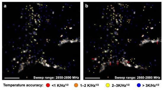 To demonstrate the results of the simulation, we applied the optimal sweep range to the ODMR measurement of the fluorescent nanodiamonds. Fluorescent nanodiamonds were placed on a cover glass, as shown in Figure 2a. The ODMR frequency spectra were then simultaneously obtained from 195 bright spots (colored dots in Figure 2a,b) in a 210 × 210 μm region by wide-field fluorescence imaging. We obtained the ODMR spectra with a sweep range of 2850–2890 MHz using a 100-point digital sweep (sweep time = 2 s) to compose two 50-point (=1 s) spectra with sweep ranges of 2860–2880 MHz and 2850–2890 MHz. By fitting the two spectra with the curve Equation (1), we obtained two Dobs values corresponding to the two sweep ranges at each bright spot. The Dobs values were determined 100 consecutive times to calculate the standard deviations to evaluate the accuracy, from which the temperature determination stability was ascertained by 1 s measurements. A tendency similar to that of the simulation was observed, and 83.7% of the bright spots showed greater temperature determination accuracy using a sweep range of 2860–2880 MHz compared to the 2850–2890 MHz sweep range (Figure 1c). Temperature determination accuracies of 3 K/Hz1/2 and 2 K/Hz1/2 or higher were obtained for 120 and 59 bright spots, respectively, by the 2860–2880 MHz sweeps; whereas, such high accuracies were obtained at 92 and 36 bright spots by the 2850–2880 MHz sweep (Figure 2a,b). In addition, six bright spots showed a temperature determination accuracy of 1 K/Hz1/2 or higher for the 2860–2880 MHz sweep; however, no bright spots showed such a high accuracy for the 2850–2890 MHz sweep.