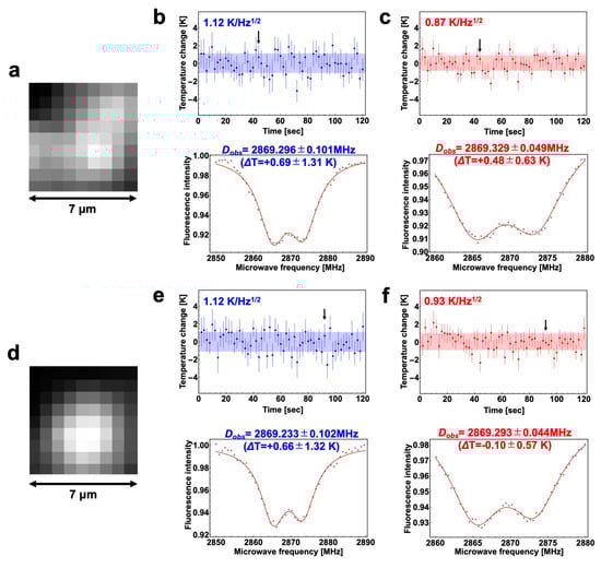 Figure 3 shows two typical results that showed a temperature determination accuracy of 1 K/Hz1/2 or higher. Figure 3a–c and Figure 3d–f correspond to the A and B bright spots shown in Figure 2a, respectively. At bright spot A (Figure 3a), the temperature determination accuracy was 1.12 K/Hz1/2 using the 2850–2890 MHz sweep range (Figure 3b top). Predictably, the accuracy was improved to 0.87 K/Hz1/2 by the 2860–2880 MHz sweep (Figure 3c top). At bright spot B (Figure 3d), the temperature determination accuracy was 1.12 K/Hz1/2 using the 2850–2890 MHz sweep range (Figure 3e top), whereas the accuracy was improved to 0.92 K/Hz1/2 using the 2860–2880 MHz sweep range (Figure 3f top).