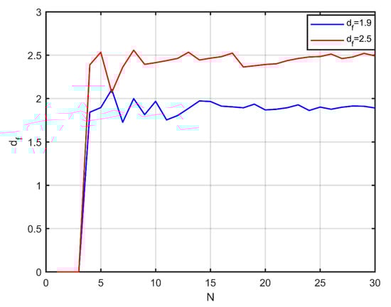 Evolution of the fractal dimension during aggregate formation using the proposed method, for two different fractal dimension values.