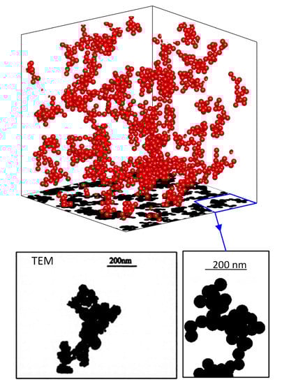 Figure 3 shows a system of nanoparticle aggregates, which includes 50 aggregates consisting of 10 to 18 particles. Their fractal dimension, , ranges between 1.8 and 2.2., and the volume fraction is . Figure 3 also shows an image from electron microscopy (TEM) of a nanofluid consisting of copper particles in water with the same characteristics []. The thresholding technique is used to create binary images from the original TEM images to simulate projection onto a plane. Respectively, in Figure 4, images from an electron microscope of two other nanocomposites [] and the corresponding simulation results are shown for visual comparison. The nanocomposites contain nickel particles with a volume fraction of for particle diameter 20 nm, and a volume fraction of for particle diameter 70 nm. Again, the thresholding technique is used to create binary images from the original TEM images in order to be able to compare projected images with simulations. It is observed that in the larger particle case, larger and denser the aggregates are formed, as shown in the TEM images. The fractal dimension of the aggregates has been found to take values from 1.8 to 2.5 [,,]. The depth of the images from the electron microscope is 100 nm.