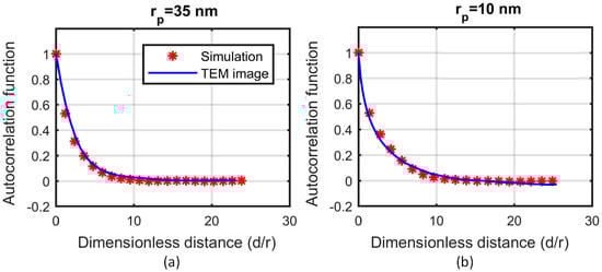 Using a specific combination of the morphological characteristics—different for each case—seems to minimise the errors in the areal porosity and the autocorrelation function. In the case of 10 nm, aggregates are selected to consist of 40 to 50 particles, with a fractal dimension between 2.0 and 2.2. Respectively, in the case of 35 nm, the aggregates are selected to consist of 80 to 100 particles, with a fractal dimension between 2.3 and 2.5. Figure 5 shows the autocorrelation function of the simulation results for the aforementioned characteristics and the TEM images. The dimensionless distance is defined as the ratio of the actual distance to the radius of the particle, . Figure 4 shows the same simulations for the sake of visual comparison with the TEM images.