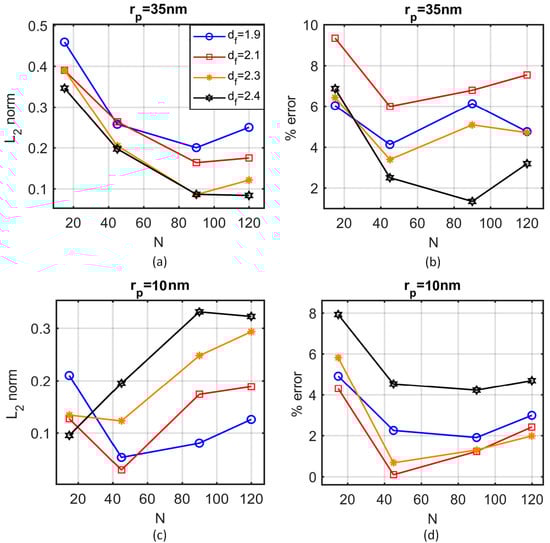 In the absence of accurate information about the fractal dimension or the number of particles in the aggregate, the 2D areal porosity and the autocorrelation function (Figure 5) are computed. Several aggregate systems were constructed by varying the average number of particles () and the fractal dimension () of the aggregates. A projection of a thin section (100 nm) of the nanofluid on a 2D plane is used to compare the autocorrelation function and the areal porosity of the simulations with those extracted from the TEM images. Figure 6 shows the norm of the autocorrelation function (Figure 6a,c) and the percentage error in the areal porosity (Figure 6b,d) for particle radius = 10 nm (Figure 6a,b) and = 35 nm (Figure 6c,d). The simulation results were derived from the average of 5 simulations, with 10 projected sections each.