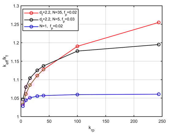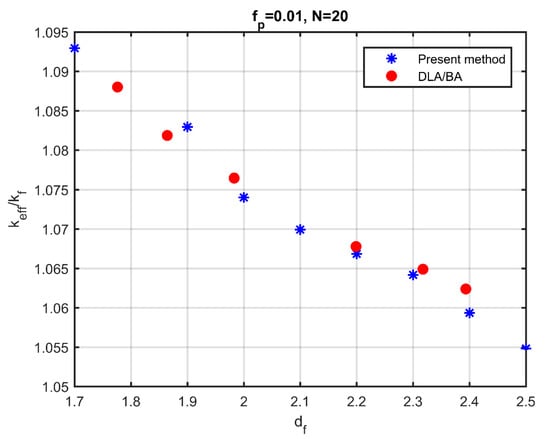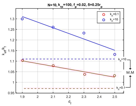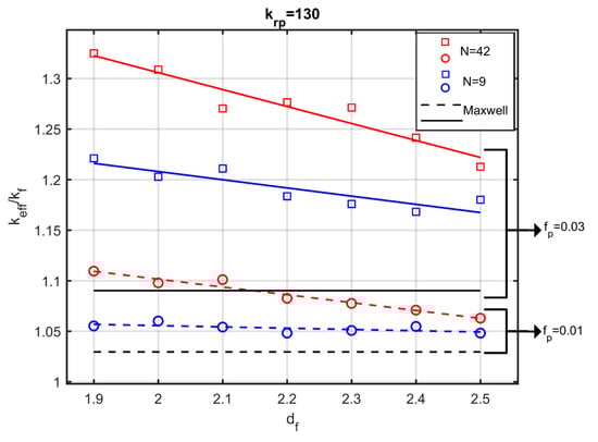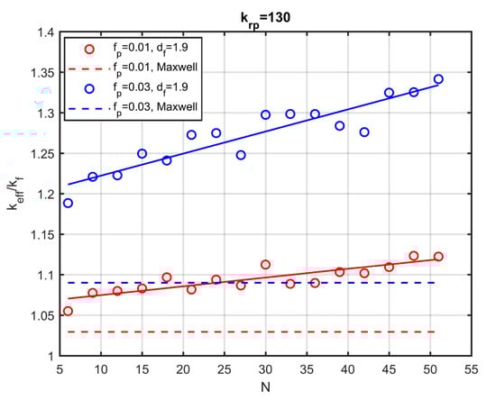 Figure 9 shows the dimensionless effective thermal conductivity as a function of the fractal dimension for two values of the particle volume fraction and for two different numbers of particles per aggregate. Figure 9 also shows the conductivity prediction according to Maxwell’s model. A first remark is that, even for small volume fractions of the particles (), a noticeable change of the conductivity is obtained by modifying the fractal dimension, while the effective-medium theory and, specifically, the Maxwell’s relation (Equation (1)), remains insensitive to the fractal dimension.