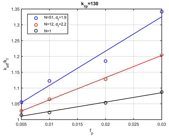 A parametric study of the effect of the fractal dimension and the number of particles in the aggregate is presented next, using the methodology that is developed in the present work. The conductivity of the nanoparticles is chosen to be 130 times greater than that of the base fluid (), which is relevant in several practical nanofluids, like water-Fe, water-CuO, and engine oil-Al2O3. The simulation points are derived from the average of ten simulations with the same characteristics (volume fraction , number of particles per aggregate , fractal dimension ).