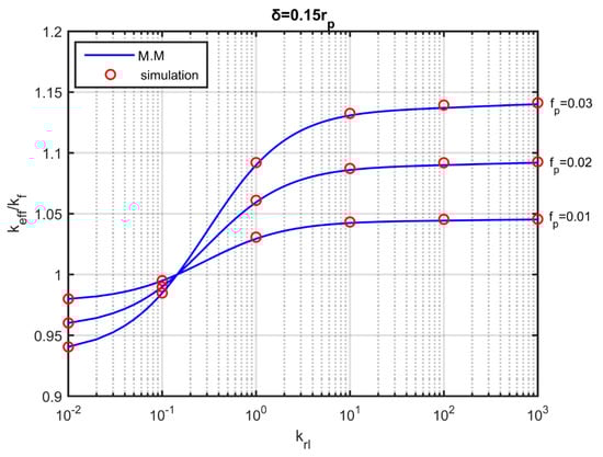 Effective thermal conductivity as a function of the nanolayer conductivity in fully dispersed particles for three volume fractions. Blue lines: results of the modified Maxwell ‘s model (M.M.). Red dots: simulation results.