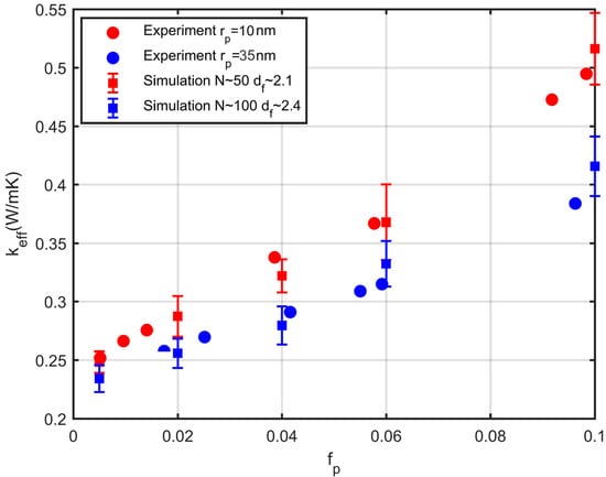 Figure 16 compares simulations and experimental measurements for SiO2 nanoparticles dispersed into water for various volume fractions. Their average radius of gyration and effective conductivity were measured in the literature []. The aggregates consist of approximately particles, and their fractal dimension is approximately []. As shown in Figure 16, the effective conductivity resulting from the simulations shows a constant deviation from the experimental data. This can be attributed to the fact that, for the stabilisation of the nanofluid, the authors of [] used the silane N-[3-(trimethoxysilyl)propyl]ethylenediamine (TMPE), with a w/w concentration of 0.05 g/mL. This is equivalent to a volume fraction of . Thus, one can estimate the thickness of the nanolayer from Equation (6), which ranges within 7–16% of the radius of the particles. The thermal conductivity of silane is about 1/3 of the conductivity of water, while the conductivity of SiO2 is 2 times greater than that of water. The thermal conductivity of the materials is shown in Table 2. Taking this into account, the agreement between simulations and experiment improves drastically, as shown in Figure 16.