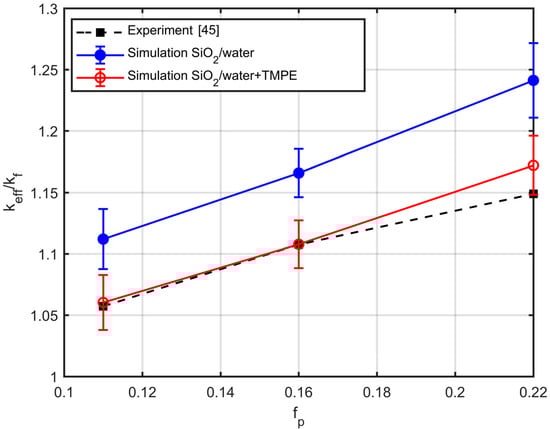 Similarly, in the context of work [], copper nanoparticles are dispersed into mineral oil, and the nanofluid is stabilised by the addition of oleic acid (O.A). The volume fraction of the oleic acid changes as follows, , where is volume fraction of copper particles. The particles are reported [] to be organised into aggregates of 14 particles, with a fractal dimension of . Figure 17 shows the experimental measurements and the results of the simulations with two options, namely, accounting for the layer of the surfactant or ignoring it. The deviation of the simulations from the experiment is about 20% when ignoring the nanolayer and is reduced to less than 3% when the nanolayer is included in the simulations.