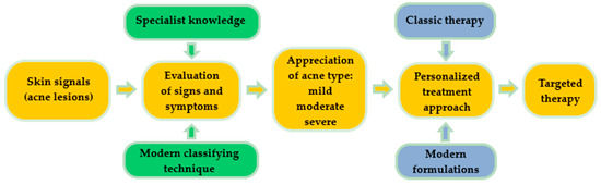 Acne is a common chronic skin condition and has been reported as one of the 10 most prevalent diseases worldwide. Its recurrent character is frequently encountered in clinical cases [11]. A proper treatment will always be suggested after a right and conclusive diagnosis, as can be observed in Figure 1. Classically, skin signal is observed in a visual inspection of the specialist. In order to increase the quality of acne diagnosis, modern classifying techniques based on convolutional neural networks are focused on the imaging and differentiation of acne lesions from healthy tissue [12]. By recognizing a skin pattern and appreciating acne evolution, personalized treatments can be created based on classical or modern pharmaceutical formulations, gently chosen to assure a targeted therapy.