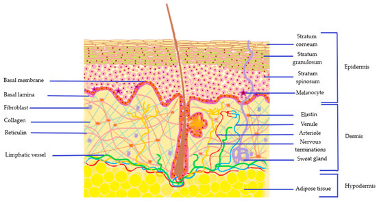 The architecture of the skin presented in Figure 2, is based on three types of layer with a specific cellular composition that promotes protection: the epidermis, dermis, and hypodermis [43,44].