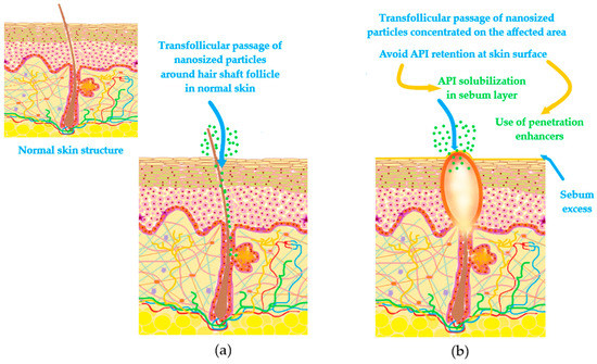 Figure 4. Transfollicular passage of nanosized particles in skin structure: (a) transfollicular passage around hair shaft follicle in normal skin; (b) modified passage accessing hair shaft follicle in acne affected skin with comedonal development and inflammation flare.