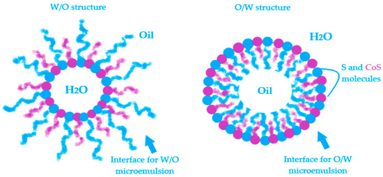The interphases O/W and W/O are defined by a surface curvature of the monomolecular layer which is oriented as a function of oil and water content and the affinity of surfactant for hydrophilic and lipophilic groups [192,193]. In Figure 5 is exemplified a model for both W/O and O/W microemulsions and the placement of surfactant and cosurfactant at the interface.