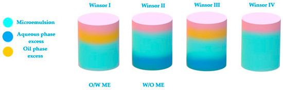 According to Figure 6, the Winsor phases found in ME formulations can briefly be described. Winsor phase I systems are O/W microemulsions in an equilibrium with an excess of oil phase in the superior area of the vial. Winsor phase II systems are W/O microemulsions with an excess of water phase in the inferior area of the vial. Winsor phase III systems defines a ternary mixture at equilibrium composed of a microemulsion in the middle area, an excess of oil phase in the superior zone, followed by an excess of aqueous phase in the inferior area. Furthermore, the ideal Winsor IV system will contain a monophasic domain, without phase excess [174,207].
