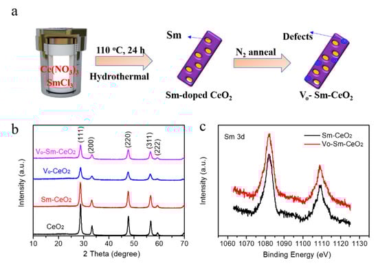 The crystal structures of CeO2, Sm–CeO2, Vo–CeO2, and Vo–Sm–CeO2 were first identified by X-ray diffraction (XRD). As described in Figure 1b, the peaks of all the prepared samples could be indexed to the (111), (200), (220), (311), (222) planes of the typical cubic structure of CeO2 (JCPD#34-0394) [34]. No other new peaks appeared for Sm–CeO2 and the Vo–Sm–CeO2 samples, suggesting that Sm2O3 was not produced, while the footprints of Sm could be detected by the X-ray photoelectron spectroscopy (XPS) (Figure 1c). The Sm 3d peaks were located at 1084 eV and 1110 eV, suggesting the existent of Sm3+ [45]. Combined with the XRD results, it confirms that Sm was doped into the Sm–CeO2 and Vo–Sm–CeO2 samples.