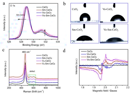 The existence of defects was confirmed by XPS, Raman, and electron spin resonance spectroscopy [47,48]. Figure 3a shows the O 1s XPS of all samples. Two strong peaks appeared at 529.1 eV and 531.3 eV for pristine CeO2 nanorods, which were indexed to lattice oxygen and surface active oxygen [49]. The lattice oxygen peak of Vo–Sm–CeO2 shifted 0.3 eV toward low energy due to the effect of Sm doping and the intensity of the surface active oxygen peak increased, suggesting the existence of more surface defects. The surface property of the four samples was detected by the contact angles with the water droplet (Figure 3b). The contact angles decreased after Sm doping and introducing defects, suggesting that Vo–Sm–CeO2 was in better contact with water. Furthermore, the Raman spectra of the four samples demonstrated the existence of defects (Figure 3c). The peak at 465 cm−1 can be indexed to the vibrational mode of fluorite-type CeO2 and the peak at 600 cm−1 was attributed to the defects [50]. Figure 3d describes the EPR image of CeO2, Sm–CeO2, Vo–CeO2, and Vo–Sm–CeO2. No obvious signal was detected in the pristine CeO2 nanorods, while Sm–CeO2 and Vo–Sm–CeO2 demonstrated a characteristic peak of defect, confirming the approach to creating defective materials [47].