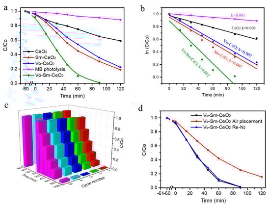 Photocatalytic stability is an important factor for the application of photocatalysts [51]. Figure 4c depicts the cycling stability of Vo–Sm–CeO2 nanorods under visible light irradiation. After five cycles of testing, the photodegradation efficiency of Vo–Sm–CeO2 nanorods reduced to 85% and the morphology and the crystal structures remained the same (Figure S4). Defects on the Vo–Sm–CeO2 surface of the nanorods can be refilled with oxygen gas, which then affects its stability, as can be observed in other reports. Therefore, we used Vo–Sm–CeO2 nanorods to anneal in air and test its performance. Just as we expected, the performance decreased, similar to the performance of the Sm–CeO2 nanorods. Interestingly, the degradation efficiency could reach 99% after re-calcining in nitrogen, suggesting that defects can also regenerate on the surface of the Vo–Sm–CeO2 nanorods (Figure 4d).