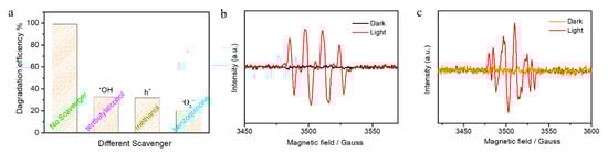 Active species such as superoxide radicals, hydroxyl radicals, and h+ play an important role in advanced oxidation processes (AOPS) technology [52]. To understand which active species generated during the photocatalytic oxidation reaction, we performed active species trapping experiments and electron spin resonance (ESR) measurements [4,34]. Figure 5a shows the photodegradation efficiency of Vo–Sm–CeO2 nanorods with different scavengers after 90 min irradiation with visible light (benzoquinone for O2−, ter-butyl alcohol for OH, and methanol for h+). Obviously, the photodegradation efficiencies decreased after adding three scavengers, suggesting that O2−, OH, and h+ are generated during photocatalysis. The active species have a high oxidizing ability to degrade MB into small molecules. Furthermore, Figure 5b,c displays the ESR results of DMPO-·OH and DMPO-O2− for Vo–Sm–CeO2 nanorods using 5,5-dimethyl-1-pyrriline noxide (DMPO) as a spin trap. No signal corresponding to DMPO-·OH and DMPO-·O2− were detected for Vo–Sm–CeO2 nanorods in the dark, suggesting ROS did not generated without light irradiation. Four strong peaks were observed when the light was turned on, which was indexed to DMPO-·OH [4,34] and six peaks corresponding to DMPO-O2− appeared, suggesting that ·O2− was produced during the photocatalysis [30]. The ESR results were consistent with the active species trapping experiments, suggesting that O2−, OH, and H+ play an extremely important role in photocatalysis.