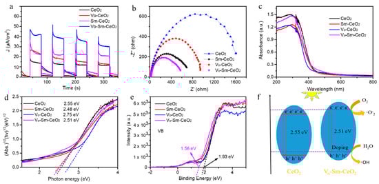 (a) Transient photocurrent responses, (b) electrochemical impedance spectra (applied potential 0.1 eV), (c) UV–Vis spectra, (d) optical band gaps, (e) VB spectra from XPS of CeO2, Sm–CeO2, Vo–CeO2, and Vo–Sm–CeO2. (f) Schematic for the proposed mechanism.