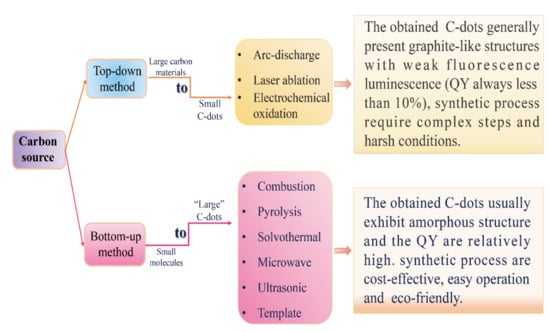 The controllable synthesis of carbon dots is currently still in the early stage of its development. The synthesis methods can be divided into two main categories, top-down and bottom-up approaches (Figure 1). The top-down approaches include electrochemical oxidation [,,], arc discharge [] and laser ablation [,,], which involve the exfoliation process of larger carbonaceous materials (e.g., large-size graphene, carbon nanotube, graphite, commercial activated carbon) into nanoscale C-dots. During the synthesis of C-dots using top-down approaches, harsh experimental conditions (e.g., strong acid and arc discharge), tedious operation steps and expensive equipment are usually employed, which greatly limit their practical application. The bottom-up approaches, such as the microwave-assisted method [,,], pyrolysis [,,], solvothermal method [,,], ultrasonic method [,,], on the contrary, convert small molecules into C-dots via carbonization and passivation. They have the advantages of cost-effectiveness, easy operation and simple equipment requirements, and hence have been widely used in the synthesis of C-dots.