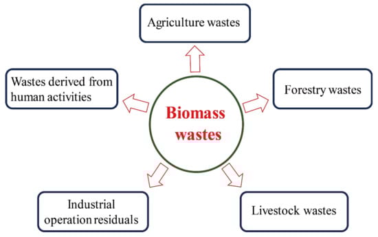 Biomass is a complex, abundant, heterogeneous, biodegradable and bio-organic substance that may be obtained from diverse sources such as perennial grass, organic domestic garbage, residues of agriculture, fishery, poultry, animal husbandry, forestry and related industries [,,] (Figure 2). Biomass waste is a natural organic carbon source, mainly composed of cellulose, hemicellulose, lignin, ash, proteins and some other ingredients. Taking plant biomass waste as an example, among which, cellulose accounts for 30–60%, hemicellulose 20–40%, lignin 15–25% []. Biomass waste is a renewable, environmentally friendly, abundantly available and innocuous carbon source for C-dots production. However, most of the biomass waste is currently discarded, landfilled or openly burned, which not only lead to a waste of resource but also cause some environmental problems threatening human health []. Recently, there have been some attempts to utilize biomass wastes as raw materials in the production of C-dots. In the following sections, the methods for the synthesis of carbon dots from biomass waste are discussed.