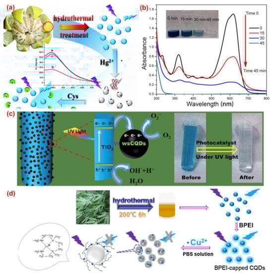 The preparation of fluorescence C-dots from biomass wastes through the hydrothermal method. (a) The preparation and application of C-dots from pomelo peel []; (b) absorption spectra of naphthol blue-black (NBB) azo dye over C-dots/ZnO at different irradiation intervals []; (c) the photocatalytic degradation of methylene blue (MB) on TiO2–C-dots composite under UV light irradiation []; (d) the synthesis and application of C-dots from bamboo leaves [].