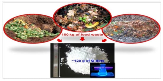 Ultrasonic-assisted method for the synthesis of C-dots has the advantages of low cost and easy operation. C-dots could be obtained through the ultrasonic treatment of mixtures of solvents and carbon sources. The properties of C-dots could be regulated by simply adjusting the experimental conditions such as the ultrasonic power, reaction time, the proportion of solvents and carbon sources, etc. Park et al. [] proposed a simple method based on ultrasonic treatment for the large-scale synthesis of water-soluble C-dots from food waste-derived carbon source and achieved the production of 120 g C-dots produced from 100 kg of food waste mixtures (Figure 6). The obtained C-dots exhibited high water solubility, high photostability, good photoluminescence and low cytotoxicity for in vitro bioimaging. Furthermore, the byproducts produced in the synthesis of C-dots from the food-waste-derived source could promote seed germination and plant growth.