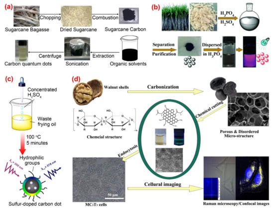 The preparation and application of C-dots by other synthetic methods. (a) The synthetic process of C-dots from sugarcane bagasse pulp []; (b) the synthesis of C-dots from bagasse []; (c) sulfur-doped carbon dots obtained from waste frying oil []; (d) the synthesis and application of C-dots from walnut shells [].