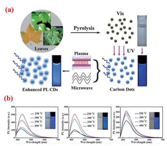 (a). Schematic illustration of the synthetic process of C-dots from different plant leaves by the pyrolysis method []; (b). The fluorescence emission spectra of the corresponding C-dots (obtained from oriental plane leaves, lotus leaves and pine needles successively from left to right) synthesized under different pyrolysis temperatures [].