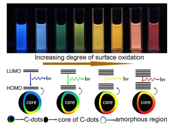 The fluorescence property is one of the most important features of C-dots, which affects their application in many fields. C-dots possess some excellent fluorescence properties, including wide excitation spectrum, narrow emission spectrum, size-dependent (or excitation wavelength-dependent) fluorescence emission, good fluorescence stability, up-conversion luminescence and strong resistance to photobleaching. Though quantum confinement effect, emissive traps, the exciton of carbon, passivated surface defects, oxygen-containing groups or aromatic structures, and free zigzag were used to explain the luminescence of C-dots [,,,], the exact luminescence mechanism of C-dots has not yet been clearly understood. Zhang et al. [] found that the fluorescence emission peak position of C-dots synthesized from polystyrene foam waste was affected by the type of organic solvent used to extract the C-dots. It was speculated that surface passivation by different organic solvents formed different surface defects on the surface of C-dots and introduced different emission sites upon C-dots, leading to the changes in the peak position and intensities of the fluorescence emission spectrum of C-dots. Ding et al. [] prepared a series of C-dots by a hydrothermal method and separated them for the mother liquor by silica column chromatography. Though these C-dots had similar distributions of particle size and graphite structure in their carbon cores, their fluorescence emission peaks positions varied from 440 to 625 nm (Figure 9). The emission wavelength was red-shifted as the degrees of surface oxidation increased. Hence, it was concluded that the degree of surface oxidation was a dominant factor affecting the fluorescence emission of C-dots. For heteroatom-doped C-dots, the binding configuration between heteroatoms and carbon atoms is the key parameter determining the fluorescence properties of the C-dots.