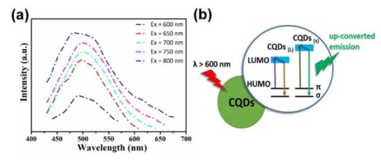 Instead of traditional down-conversion fluorescence, some C-dots obtained from biomass waste show special upconversion fluorescence with emission wavelength shorter than the excitation wavelength [,,]. Two kinds of popular mechanisms of anti-stokes photoluminescence and multiphoton active process are usually used to explain the phenomenon of upconversion fluorescence. Wu’s group [] prepared C-dots with upconversion photoluminescence properties from walnut shells and introduced an electronic transition process model to explain the upconversion phenomenon. The electronic transition process model says that an increase in the particle size of C-dots causes a decrease in the gap between LOMO and HOMO. The carbine ground-state multiplicity induces the electronic anti-stokes from the energy level of π to σ. The electrons at the π orbitals can be excited by low energy light with wavelengths over 600 nm and transit to the excited state with higher energy (LOMO). When the electrons return back to the ground -σ state in the form of irradiation, upconversion luminescence occurs (Figure 10). Sun et al. [] suggested that a multiphoton active process may be the most likely mechanism for the upconversion luminescence of sulfur and nitrogen co-doped C-dots obtained from hair fiber (Figure 11). C-dots with upconversion fluorescence property have special advantages in optical in vivo imaging due to the strong tissue penetration of red light and weak auto-fluorescence interference in the red–light region from biological tissues. The upconversion photoluminescence property of C-dots also lays a good foundation for the practical application of C-dots in the field of two-photon imaging.