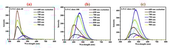 Upconversion photoluminescence properties of S-N-co-doped C-dots obtained from hair fiber under different conditions. (a) 40 °C; (b) 100 °C; (c) 140 °C [].