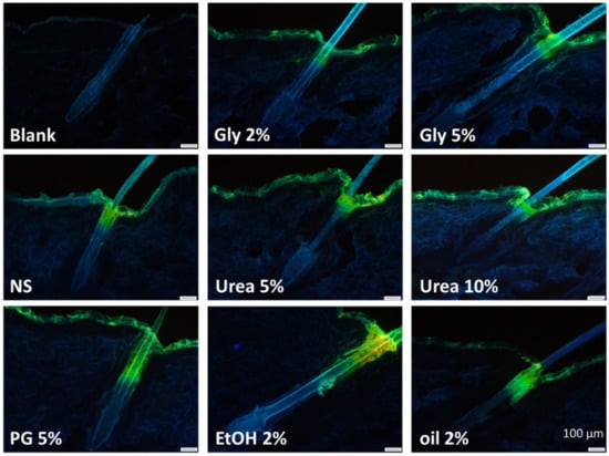 One-tailed tests compare mean values of two independent groups in only one direction and thus are considered to provide more power to detect whether a mean of a population is larger or smaller than the mean of another population [53]. Based on the observations in our previous study, where the addition of 5% glycerol was found to decrease the penetration depth of the curcumin nanocrystals [12], we hypothesized that also in this study the addition of glycerol would lead to a decrease in penetration depth. As we assumed that the effect occurs due to a swelling of the hair shaft and/or changes in the structure of the hair cuticula and is caused by the hygroscopic properties of the glycerol, we also hypothesized that urea and propylene glycol—which are also known to possess hygroscopic properties—will cause similar effects. Based on the significant results from the t-tests, the hypothesis was confirmed for glycerol and urea but was disproved for propylene glycol. The results therefore indicated that the size of the nanoparticles and the hygroscopic properties of the excipients might not be the sole parameters that affect and modulate the penetration efficacy of nanocrystals into hair follicles.