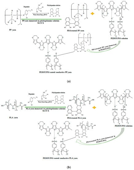 Possible key chemical reactions involved for producing PEDOT:PSS coated conductive (a) PP and (b) PLA yarn.