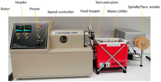 A melt spinner (LE-075 Mixing Extruder, CSI, USA) shown in Figure 2 was used for producing thermoplastic melt spun yarns. Poly (lactic acid) (PLA) was provided by Imagin Plastics Ltd., Auckland, New Zealand (average molecular weight, Mw~2.08 × 105, melt flow index, MFI~210 °C/2.16 kg of 15–25 g/10 min). Polypropylene (PP) was procured from Lyondell Basell, New Zealand (Mw~2.20 × 105, MFI~230 °C/2.16 kg of 25 g/10 min). PEDOT:PSS dispersion was purchased from Sigma-Aldrich, New Zealand with a ratio of PSS:PEDOT = 1:1.5, pH = 2–3.5 used as conducting material. Tris hydrochloride (Tris HCl) (Bio-Froxx, GmbH, Germany) was used as buffer agent and dopamine hydrochloride (98%, Sigma-Aldrich, New Zealand) was used as binding agent for surface modification of thermoplastic yarn. Hydrochloric acid (HCl) (Sigma-Aldrich, New Zealand) was used to maintain pH = 8.5 for dopamine and Tris HCl solution.