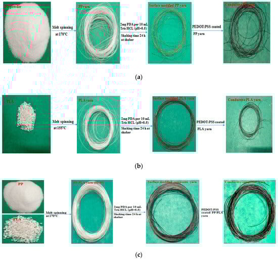 Schematic diagram of PEDOT:PSS coated conductive (a) PP, (b) PLA and (c) blend PP/PLA yarn.