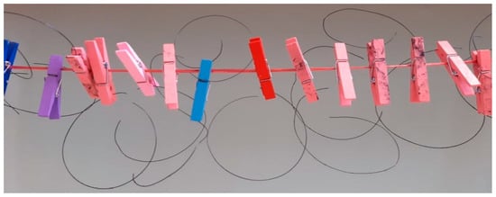 These hydrophobic yarns were chemically modified to increase the hydrophilicity with PDA and Tris HCl. 12.11 g Tris HCl was added in 80 mL distilled water and pH = 8.5 was maintained by gently adding 1 µM of hydrochloric acid (HCl) for producing Tris HCl solution. 2 mg of dopamine hydrochloride per 10 mM Tris HCl was added to produce the aqueous solution. PP, PLA, and blend PP/PLA based hydrophobic yarns were immersed in this aqueous solution and kept in a shaker for 24 h with 55 rpm at room temperature. The surface modified yarns were rinsed with distilled water for 1 min and line dried at room temperature. These PDA treated hydrophilic PP, PLA and blend PP/PLA yarns were immersed in PEDOT:PSS dispersion for 5 min. Then the coated yarns were dried at room temperature for 4 h by hanging them on a clothes line using wooden clip hangers shown in Figure 4. This coating process was repeated for two dip coating cycles. All the thermoplastic yarns were coated for two times considering the flexibility, stiffness, and rigidity of conductive yarns. Though more coating cycles increased the conductivity but made the yarns stiff and rigid. Stiff and rigid yarns are not suitable for integrating into textiles for wearable applications. The above fabrication process can be described as: production of thermoplastic yarns by melt spinning > surface modification by polydopamine > PEDOT:PSS coated conductive yarns by dip coating.