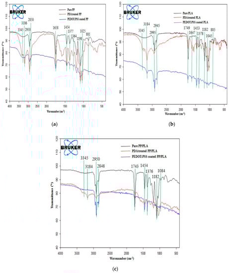 The functional groups of all the samples such as pure PP, pure PLA, blend PP/PLA, PDA and PEDOT:PSS were confirmed by interpretation of the FTIR spectra. Figure 5a, Figure 5b, and Figure 5c represent the FTIR spectra of PDA treated and PEDOT:PSS coated conductive PP, PLA and PP/PLA yarns respectively. All the transmittance bands are also listed in Table 1. Here Figure 5a depicts the transmittance bands corresponding to PP at 2950–2850 cm−1, 1454 cm−1 and 1377 cm−1 were assigned to C–H stretching, –CH3 bending and C–H bending respectively [30]. Here Figure 5b depicts the FTIR spectra of PLA, transmittance bands at 2995–2945 cm−1, 1749 cm−1, 1182–1045 cm−1 and 1453 cm−1 referred to CH and CH3 group, C=O stretching, symmetric C–O–C stretching and asymmetric bending absorption of CH3 respectively [63]. Ploypeetchara et al. [64] analyzed the spectra of different PP/PLA ratios and found the transmittance bands that represent PP and PLA were observed in the PP/PLA blend around 2952–2848cm−1, 1456–1454 cm−1, 1376 cm−1, 1183–1182 cm−1 and 1086–1184 cm−1. A specific peak for all PP/PLA blends appeared at 1749 cm−1 is corresponded to the stretching of the ester group (–COO) where the chemical interaction of the anhydride group of PP with the carbonyl group of PLA formed a new linkage which indicates the PP/PLA blends [37]. From Figure 5c, the transmittance bands that represent PP and PLA were observed in the PP/PLA blends around 2950–2848 cm−1, 1743 cm−1, 1454 cm−1, 1376 cm−1 and 1182 cm−1. After surface modification of PP, PLA and PP/PLA by PDA, the transmittance bands at 3186–3345 cm−1; 3184–3345 cm−1 and 3184–3345 cm−1 respectively corresponded to stretching vibrations of O–H and N–H groups of PDA [65].