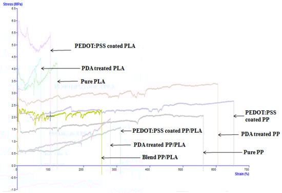 Figure 7 shows all full stress-strain curves for analyzing the tensile strength, Young’s modulus, and elongation at break%. From Table 3, it is seen that PLA yarns have better tensile strength compared to PP and PP/PLA yarns. The tensile strength of pure PP, pure PLA, blend PP/PLA, polydopamine treated and PEDOT:PSS coated PP, PLA and PP/PLA is 1.22 MPa, 1.81 MPa, 1.97 MPa; 2.99 MPa, 3.41 MPa, 3.57 MPa; and 1.35 MPa, 2.08 MPa, 2.56 MPa respectively. Moreover, the tensile strength of PP/PLA blends improved with the addition of the PLA content due to the higher Young’s modulus of the PLA yarn compared to the PP yarn. The bridged two immiscible PP and PLA polymers have formed a strong chemical bond which was confirmed by the FTIR analysis. However, polydopamine treatment and PEDOT:PSS coating also increased the mechanical properties of these treated and coated yarns. The mechanical properties of PP/PLA blends are strongly influenced with greater physical properties of PLA including the degree of crystallinity, melting point, density, heat capacity hardness, Young’s modulus, tensile strength, glass transition temperature, and mechanical properties.